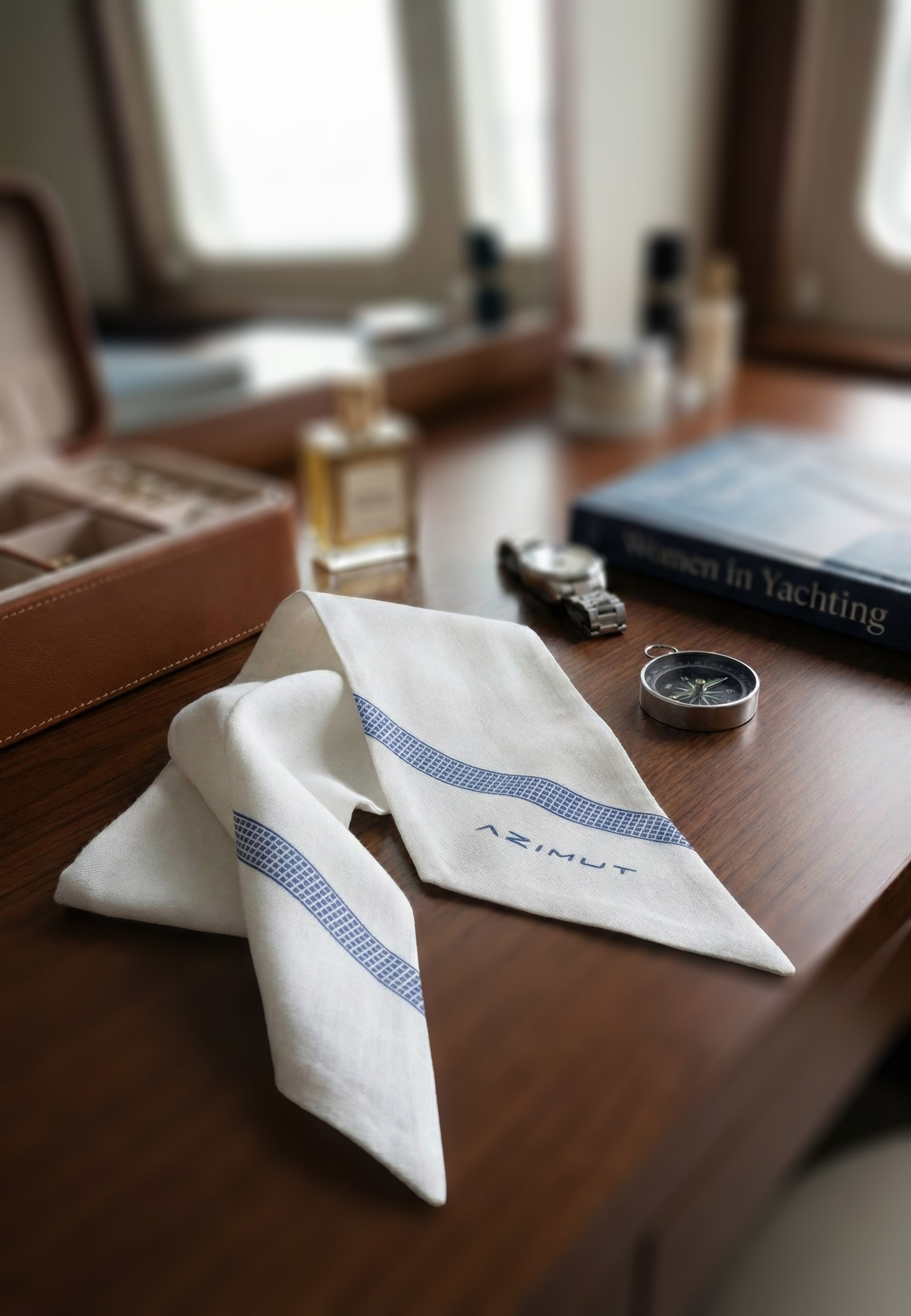 Twilly Azimut artigianale in 100% seta, Made in Italy. Colore bianco con microfantasia a piccoli quadretti azzurri.